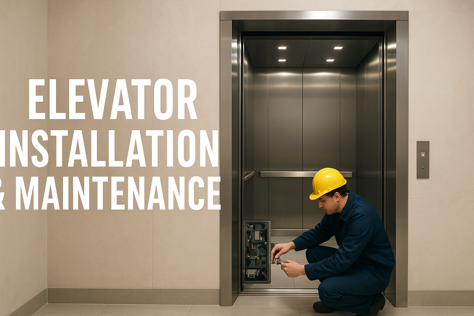 Elevator Installation & Maintenance Visual: Modern elevator shaft with technicians working, or a sleek, glass elevator in a building lobby.